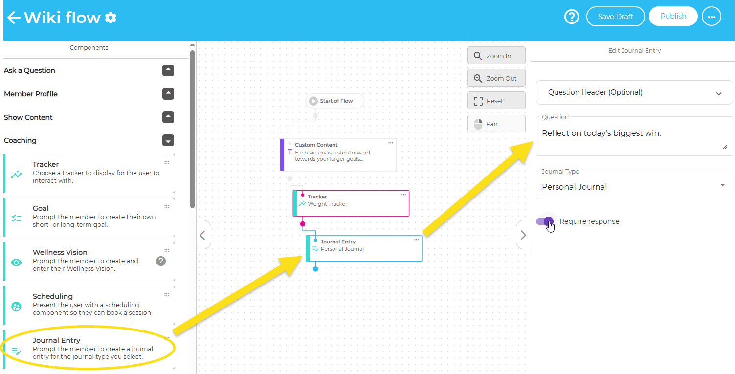 Flows can now include a Journal Entry component, giving members space for structured reflection as they move through an experience. When members reach this step, they’ll see the familiar journal editor (including rich text, emoji, and image upload where enabled), and their entry is saved directly to their journal.