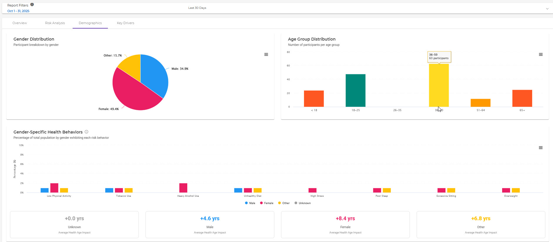 Overview Tab: Summary metrics and charts showing participation, average health age impact, and population risk distribution:
