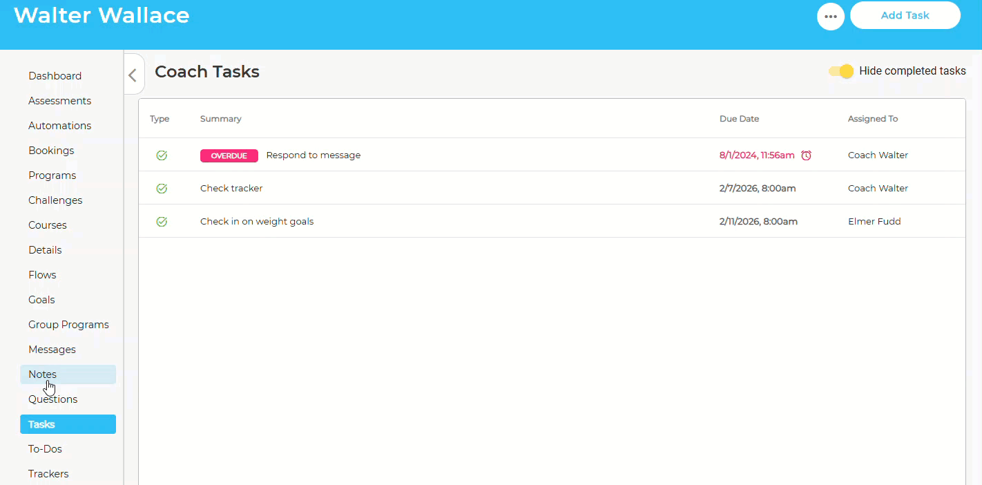 The Member Admin dashboard will gain a new Tasks tab showing coach-assigned tasks in one place, with clear visibility into task type, ownership, and due dates. A simple toggle makes it easy to focus only on active tasks by hiding completed ones.